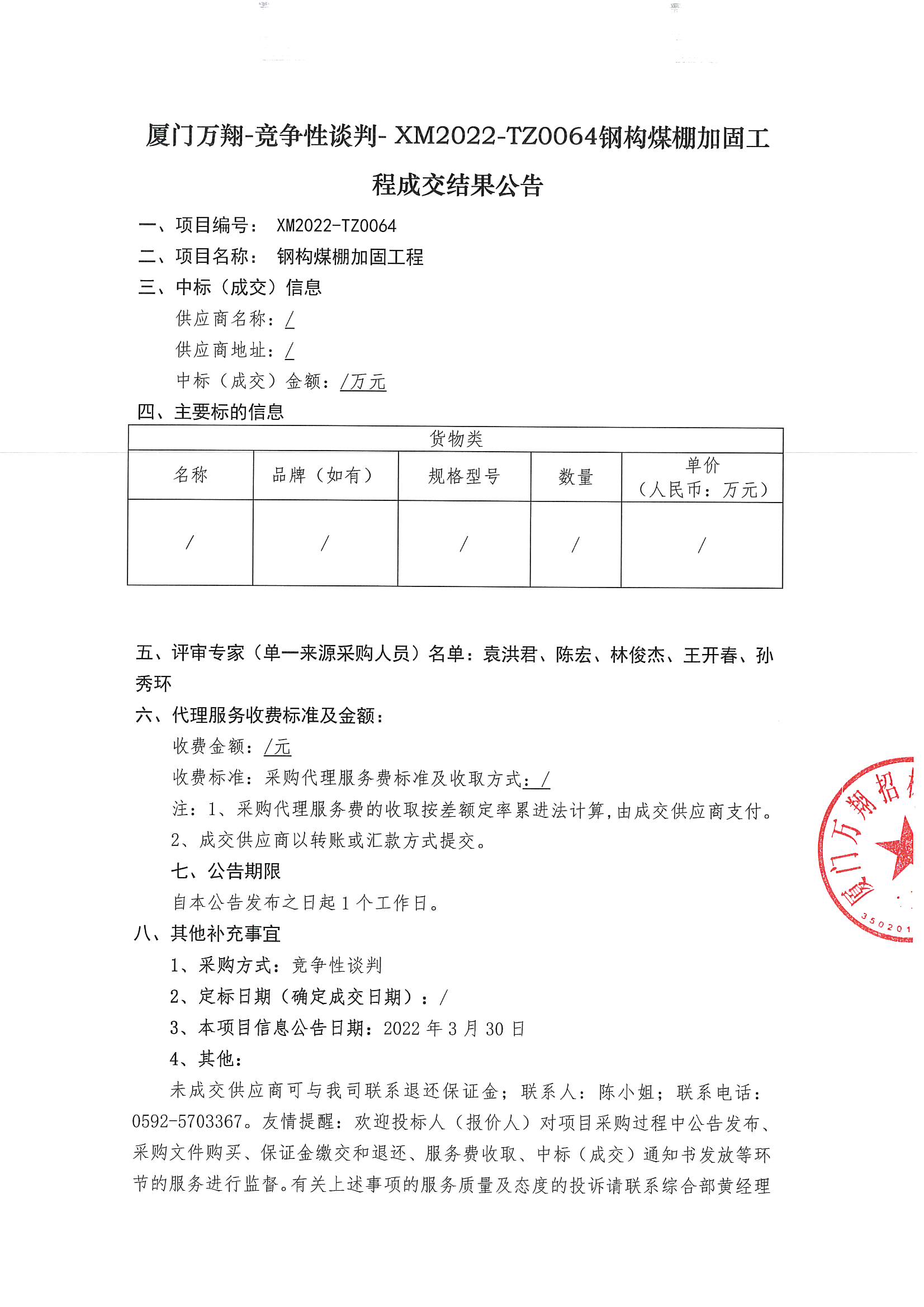 廈門(mén)萬(wàn)翔-競(jìng)爭(zhēng)性談判-XM2022-TZ0064鋼構(gòu)煤棚加固工程成交結(jié)果公告
